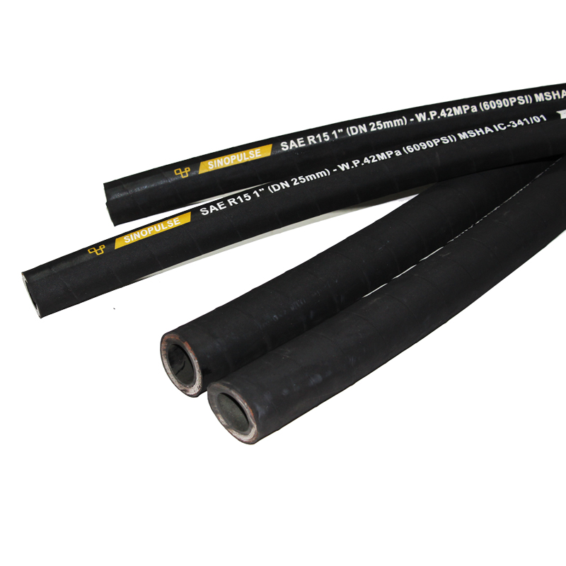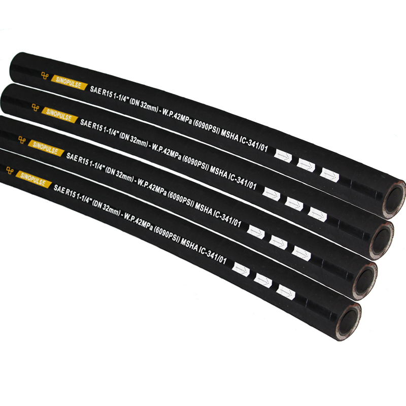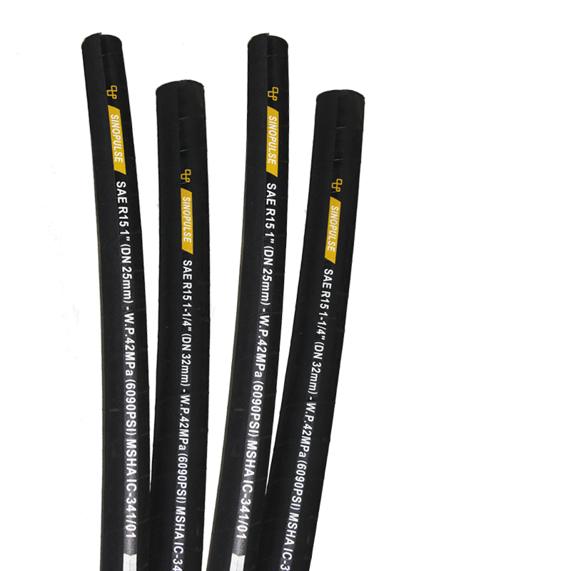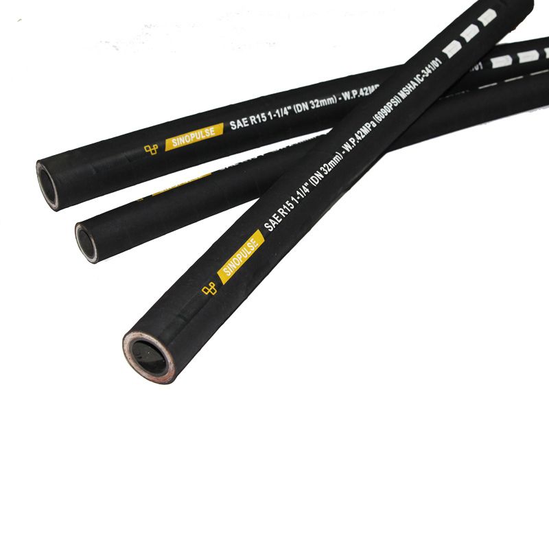 Hydraulic hose SAEJ517 100R15, this is the hose was reinforced by six steel wire multiple spiral and with the middle rubber and a braid of textile material. This hose can be used under 121℃, and supper high pressure such as the construction machines, mining and he high performance industrial market.
